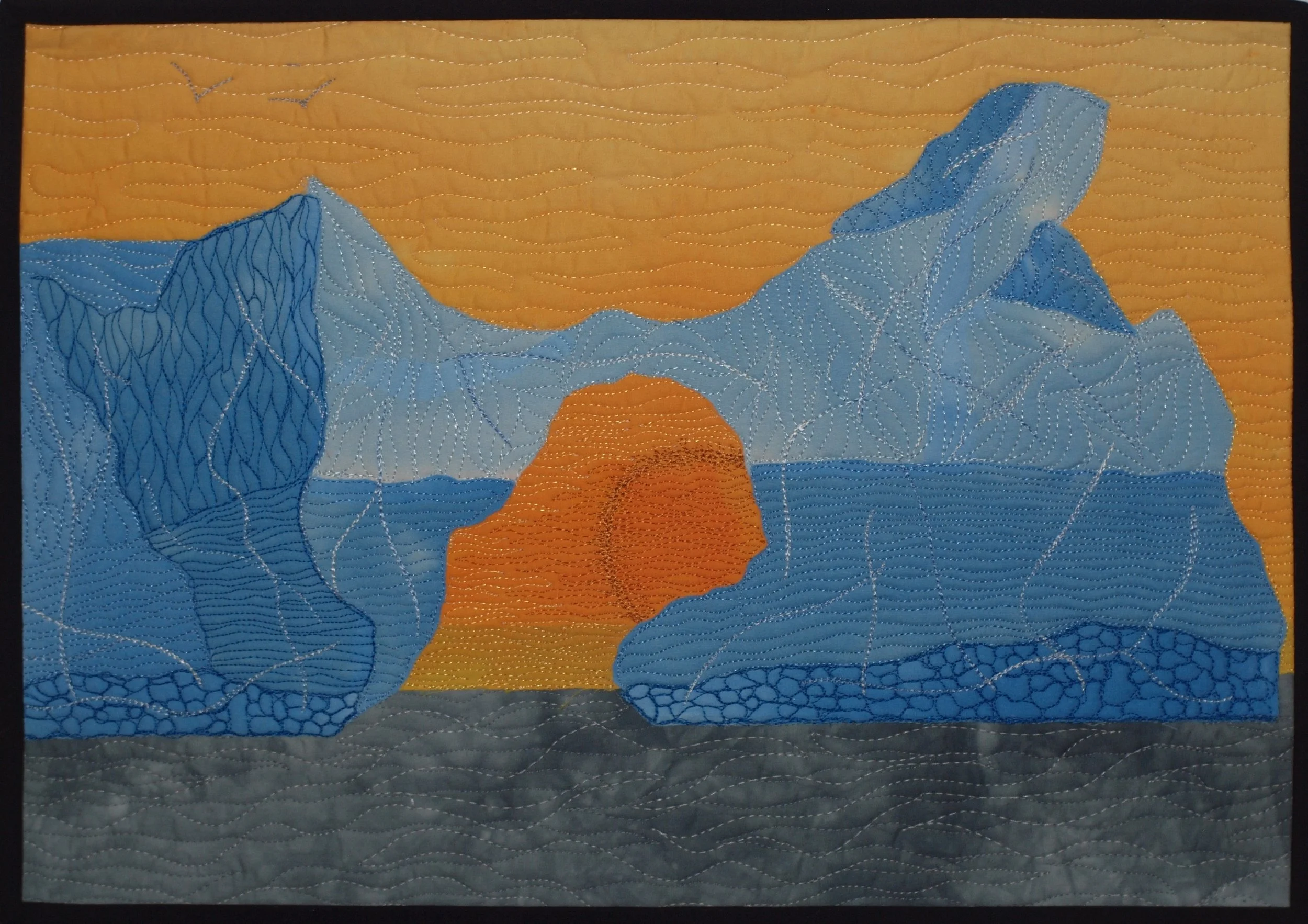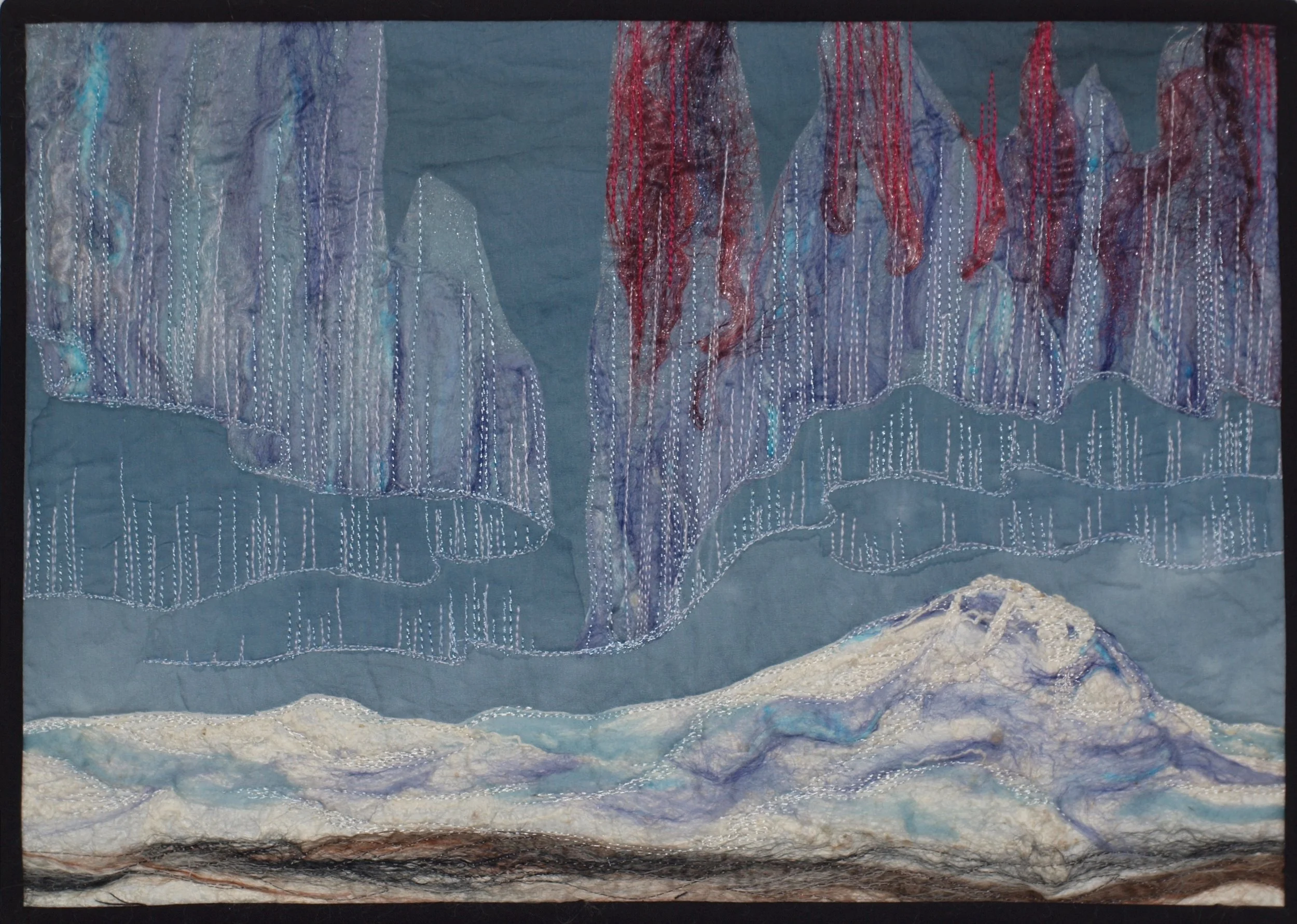 Fabrics: Hand dyed cotton. Hand painted skyline. Wool/silk fibre fabric. Cotton batting. Commercial fabric for backing and binding.