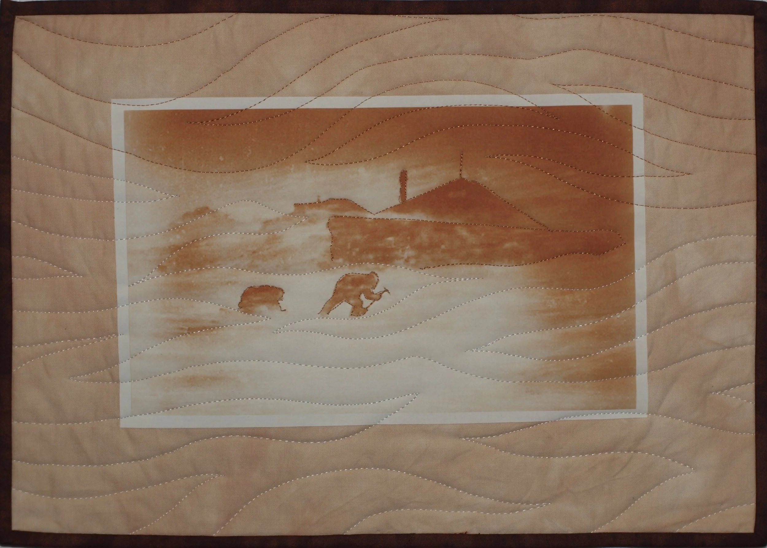Fabrics: Tea dyed cotton ink jet printed. Cotton batting. Commercial backing and binding. Photo Reference: AAP Frank Hurley.
