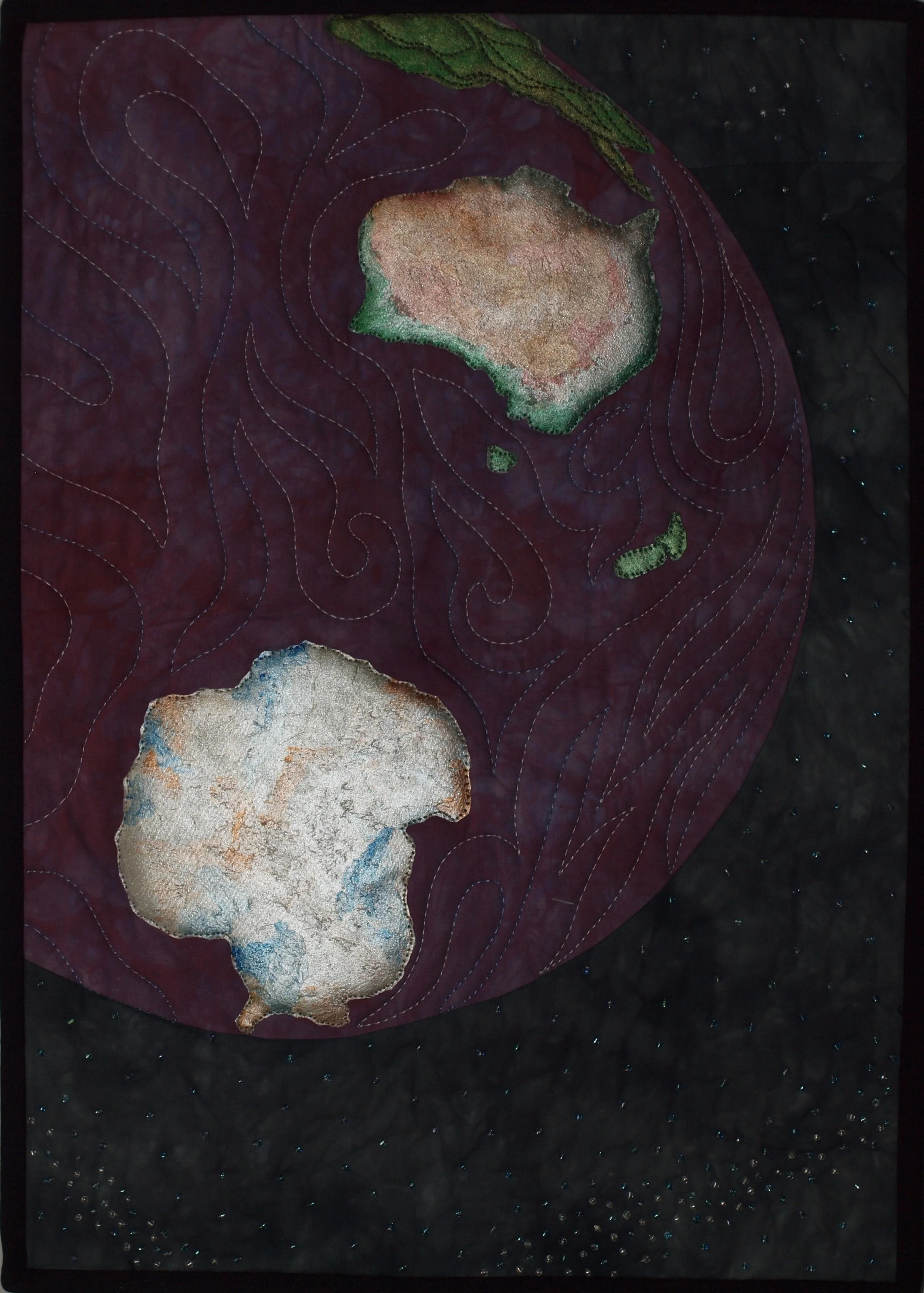 Fabrics: Hand dyed cotton. Hand painted skyline. Shiva stick texture rubbings. Wool/silk fibre fabric. Cotton batting. Commercial fabric for backing and binding.