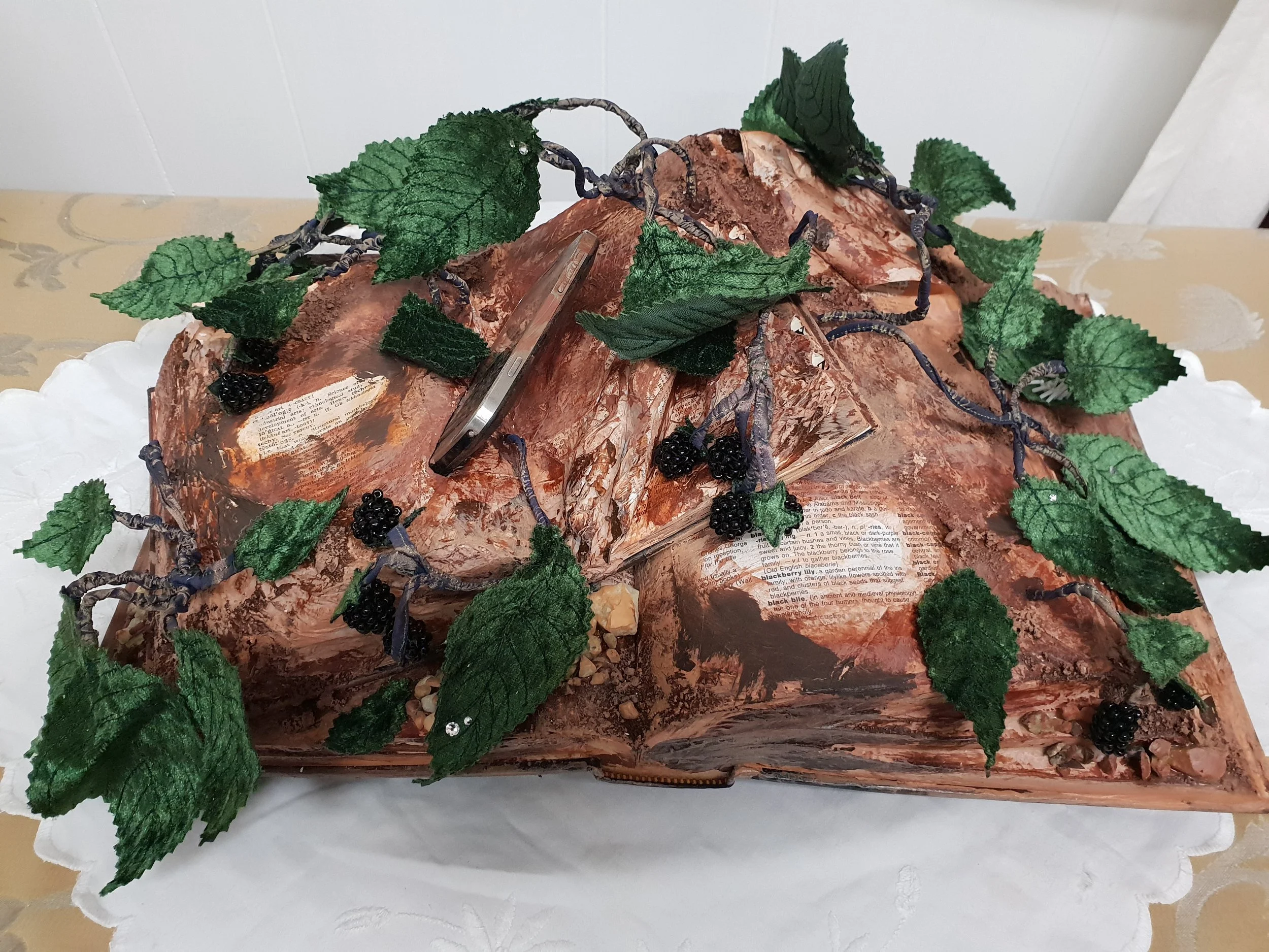 Velvet leaves, cotton with wire stems, hand made bead blackberries, dictionaries 1 with the word “Blackberry” and the other with the word “Technology”, Blackberry phone, crystals.
