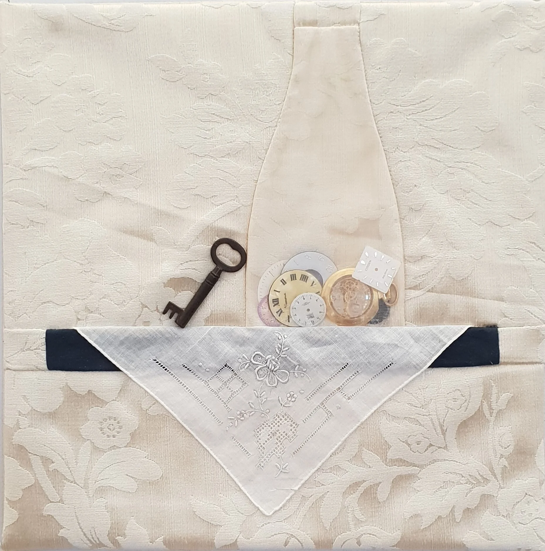 Damask, vintage handkerchief, cotton, organza, watch faces and a key.