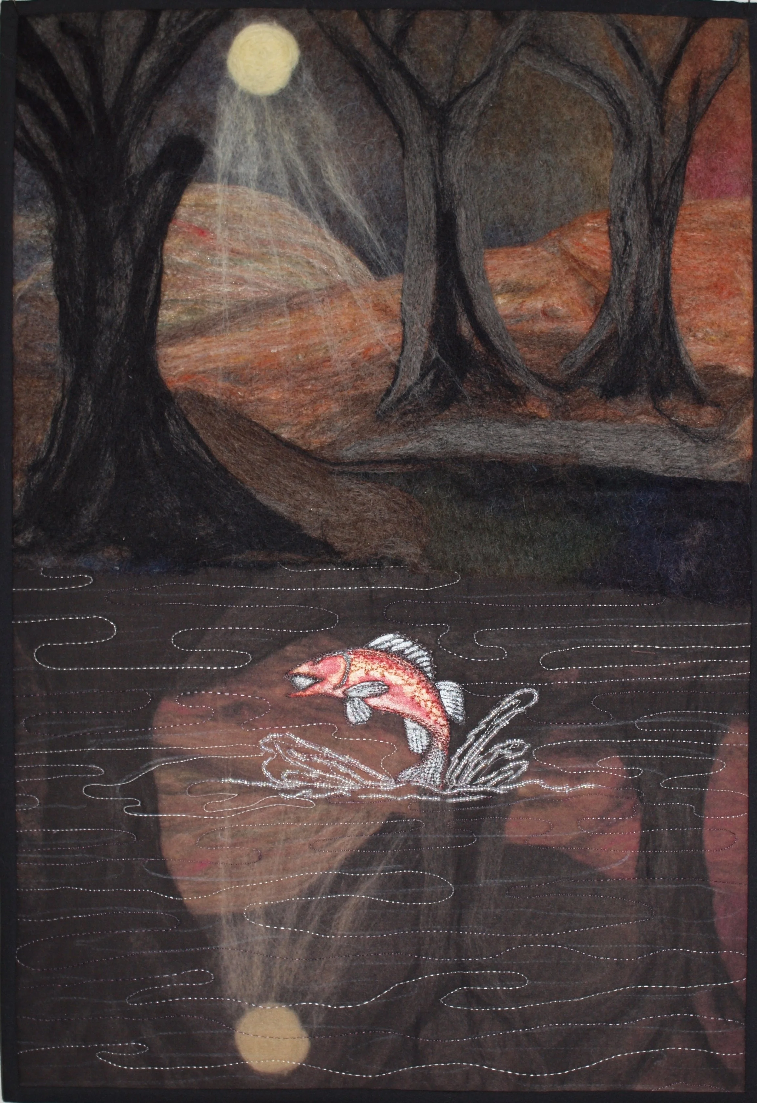 Machine felted background (top), photographed then printed for base reflection, beads, hand painted trout.