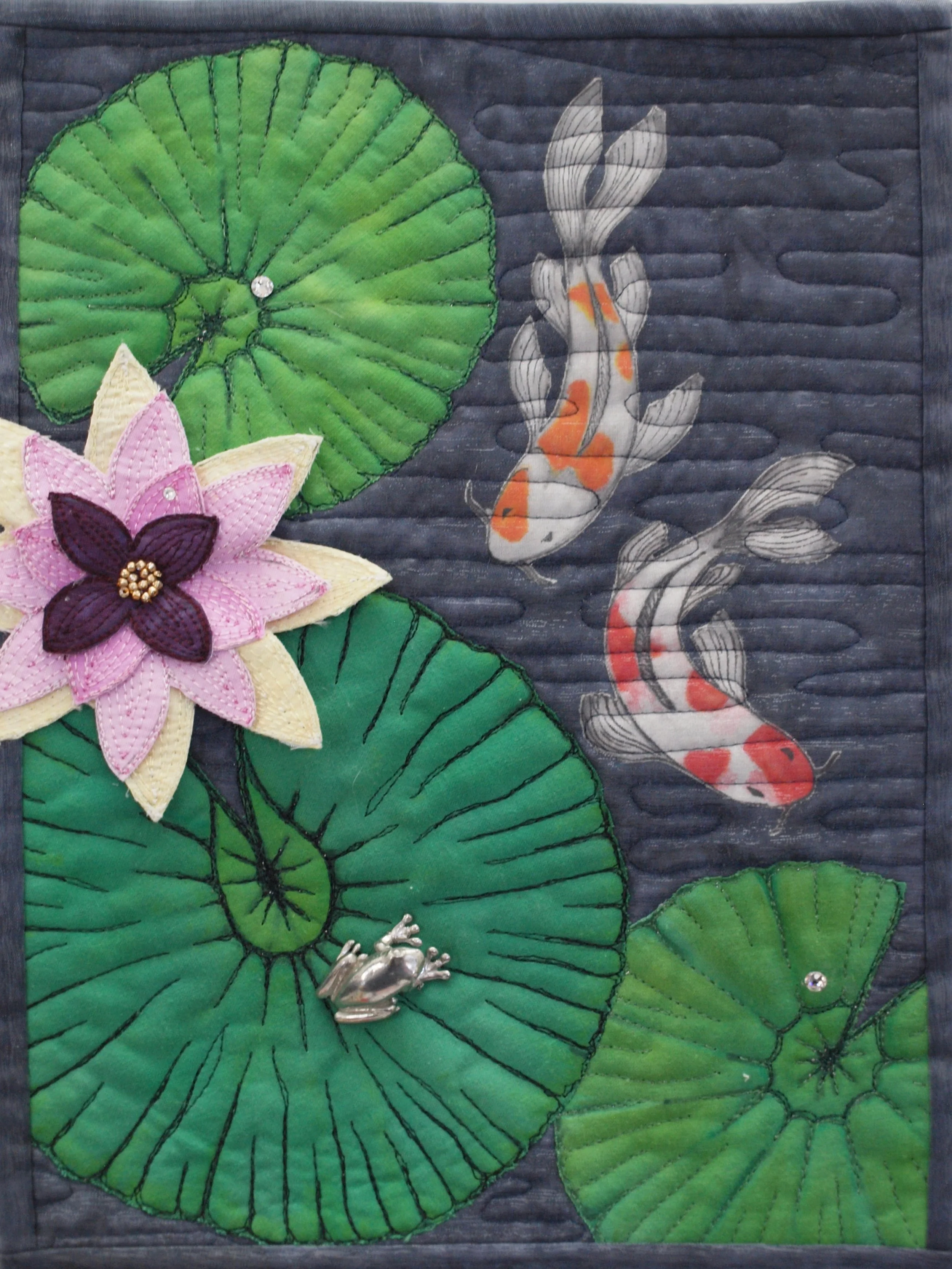 Hand dyed cotton, hand painted lily pads and Koi, beads, crystals.
