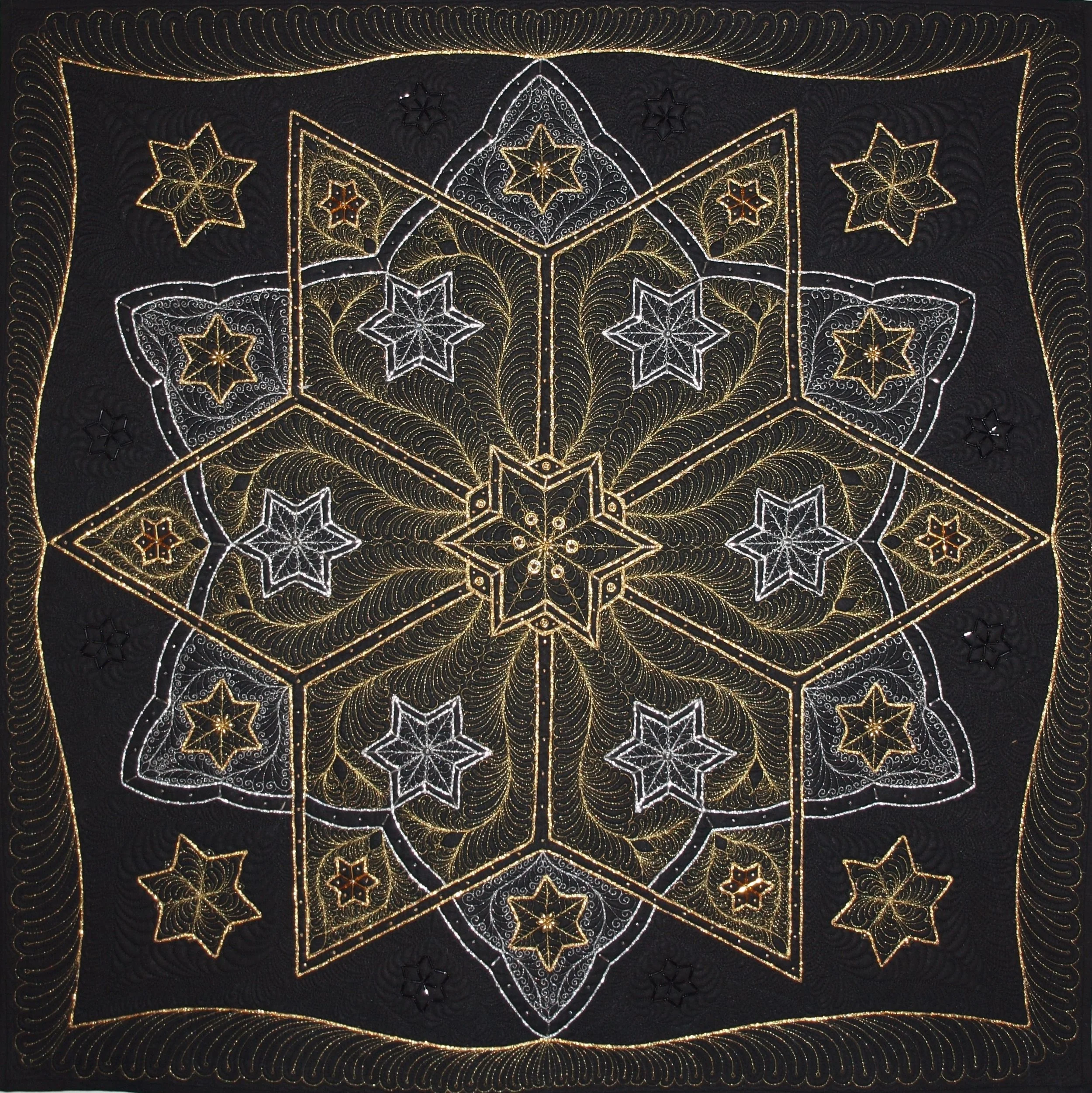 Black Cotton, silver and gold corded thread. Silver, gold and black thread free motion quilted. Embellished with crystals.